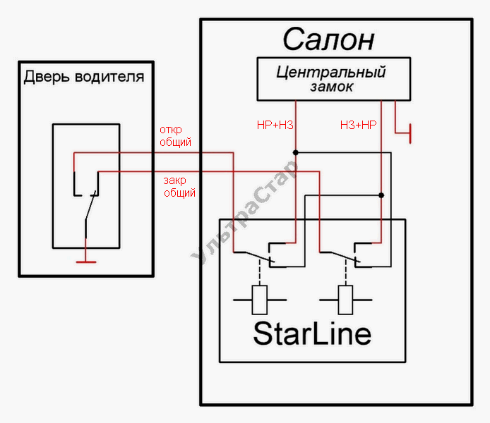 На схеме нарисованы общие, НЗ и НР контакты встроенных реле сигнализаций. Черно-красный (НР) необходимо разрезать, нарастить и подключить по схеме. Если после подключения сигнализация будет закрывать вместо открытия, то поменять местами синий и зеленый.