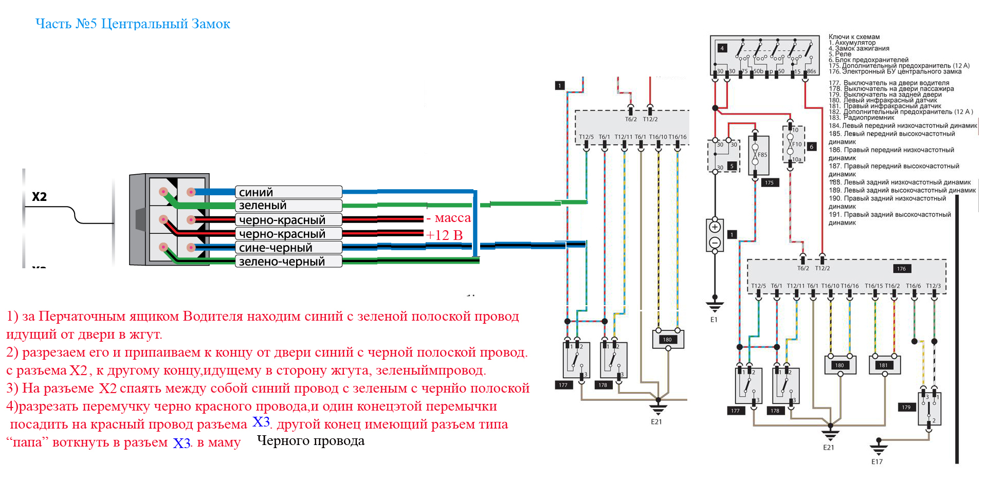 синий доп. для управления стеклоподъемниками и люком. посадил через реле. так же на провод идущий от личинки замка к управлению(центральному замку(компрессор там стоит с блоком комфорта))... думаю что поставлю просто закрытие на 1 кнопку а закрытие с доводчиком люка и стекол на другую кнопку( могу ошибаться)