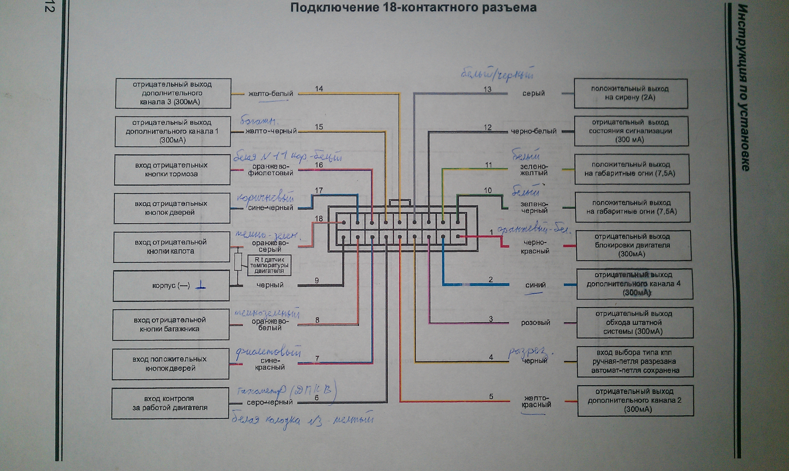 Ну вообще-то провод включения обходчика ИММО в этой сигнализации розовый. Черно-белый в 18-контактном - ПРОВОД СОСТОЯНИЯ. Он активируется в режиме ОХРАНА и НЕ ОТКЛЮЧАЕТСЯ ПРИ АВТО/ДИСТЗАПУСКЕ. Использовать его для доп.блокировок нельзя, так как мотор не заведется при авто/дистзапуске. Обычно его используют на более навороченных машинах (например VW) для недопущения открытия багажника злоумышленниками при работе мотора, заведенного автозапуском (на этих авто при включении зажигания разрешается работа электронной кнопки отпирания багажника на его крышке).