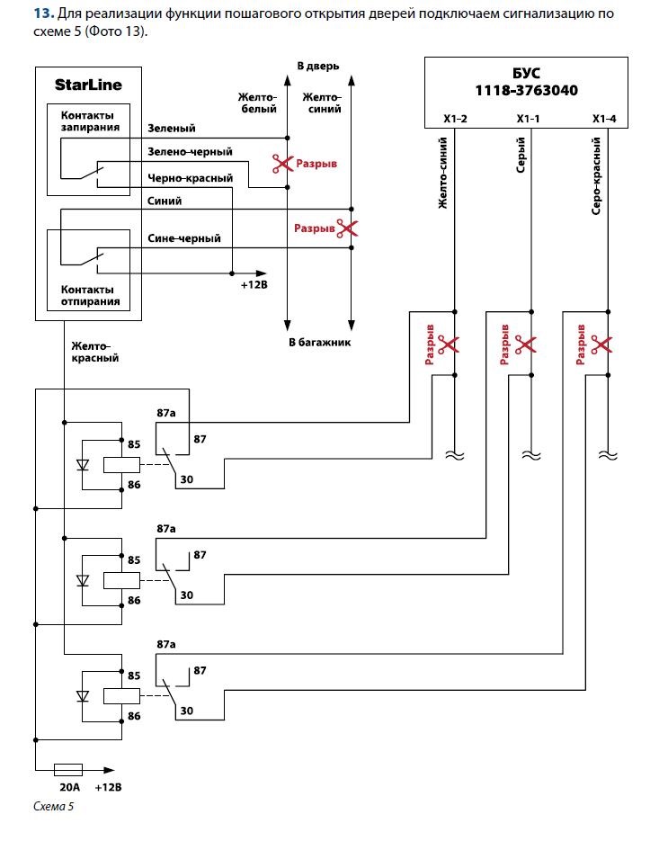 у меня калина люкс, устанавливал сигналюгу сам. сделал автозапуск, запуск по температуре, открытие водительской двери и закрытие всех дверей. сейчас решил сделать пошаговое открытие дверей. как в мурзилке написано купил 5 контактное реле. и начал подключать. подключил по этой схеме