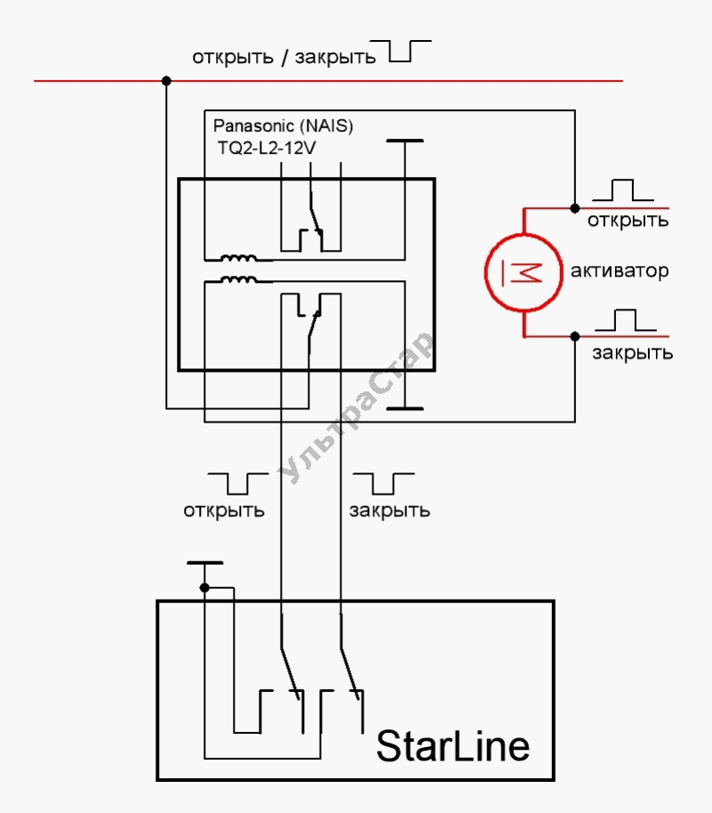 Некоторые автомобили имеют управление ц.з. по одному проводу чередующимися импульсами отрицательной полярности (Astra H, Corsa D), т.е. появился первый импульс - ц.з. закрылся, появился второй импульс - ц.з. открылся, появился третий импульс - ц.з. закрылся и т.д. Особенность заключается в том, что при подаче импульсов с помощью сигнализации может произойти рассинхронизация с состоянием центрального замка (например, не плотно закрыта дверь). В этом случае вместо закрытия произойдет открытие центрального замка. Если нет возможности использовать can-модуль, то можно воспользоваться двухобмоточным поляризованным реле, например Panasonic (ранее - NAIS) TQ2-L2-12V. Схема ниже. Переключение контактов реле будет происходить при появлении импульса положительной полярности на проводе активатора. Состояние контакта сохраняется неограниченное время и меняется при подаче питания на обмотку реле. При использовании этой схемы сбой в работе центрального замка не наблюдается.
