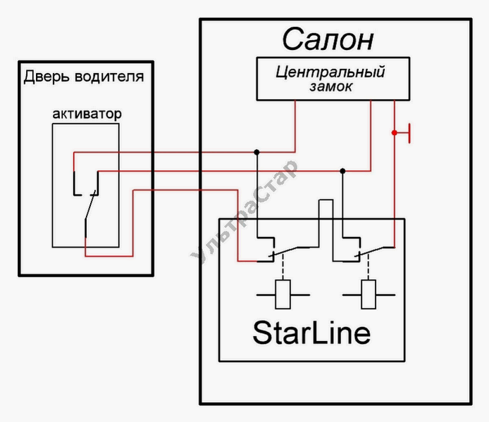 Если есть возможность подключиться в салоне автомобиля к проводу массы пятипроводного активатора водительской двери, то необходимо использовать схему