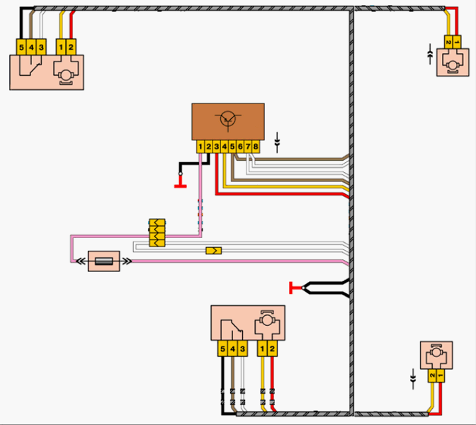 Пятипроводный активатор содержит переключатель с общим контактом и двумя переключающимися (черный, коричневый и белый провода на схеме). При перемещении штока этого активатора вверх или вниз происходит коммутация контактов переключателя. При этом масса коммутируется с общего контакта на один из входов управления модуля ц.з и модуль подает импульс +12В на электромоторы всех активаторов. Таким образом, подавая массу на коричневый и белый провода активатора, можно управлять модулем центрального замка.
