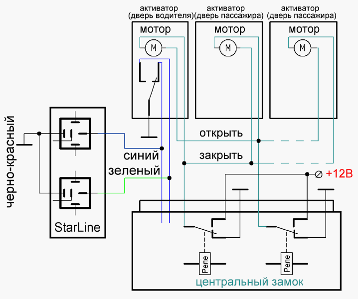 - разорвать эти провода и подключить к ним встроенные реле сигнализации по аналогичной схеме . В этом случае сигнализация будет управлять не одним активатором, а всеми. При этом увеличивается нагрузка на встроенные реле сигнализации, что необходимо учесть.