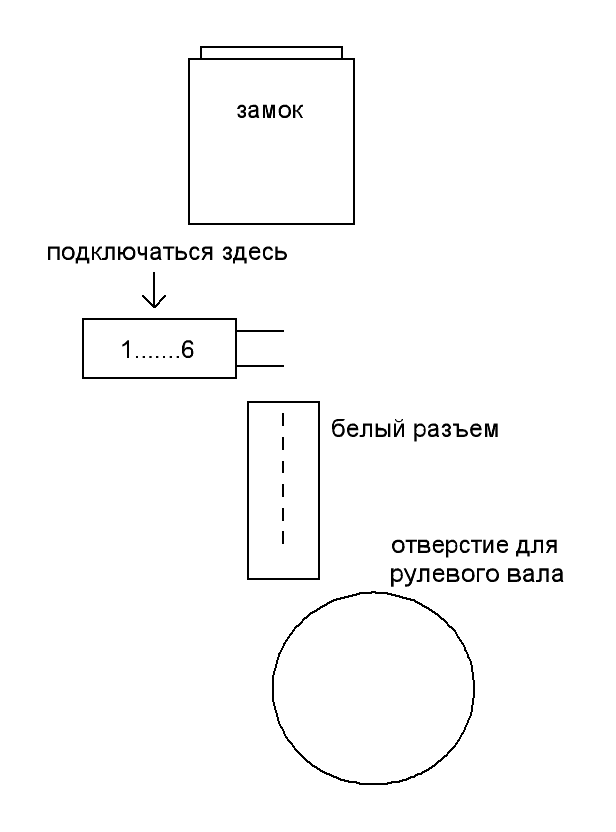 8. Снять замок (необходимо вставить ключ, чтобы снять замок). После снятия будет видно белый прямоугольный разъем, перпендикулярно которому 6 контактов. При этом сам замок смотрит вверх, белый разъем на себя. Пусть контакт 1 будет дальним от белого разъема. Для запуска нужны 3 контакта– АСС, IGN и Starter. На всякий случай лучше подключить и статус ключа в замке, чтобы штатная электроника не удивлялась работающему двигателю без ключа в замке, поэтому понадобятся 4 контакта – 1,3,4,5.