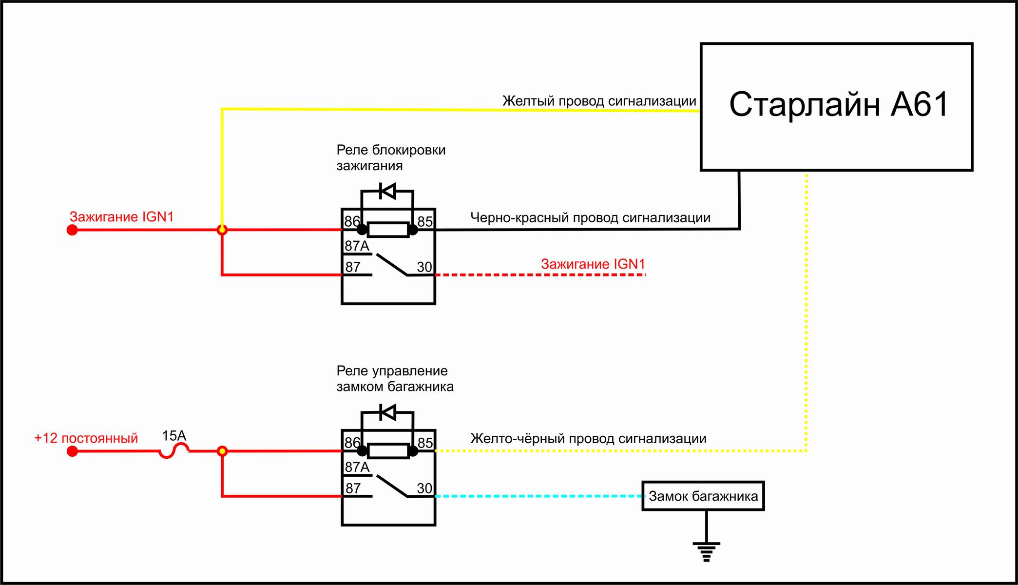 Александр29 писал(а): Ставил другой блоки сигнализации В61, ситуация идентична.Если вытянуть предохранитель реле замка багажника, то плюс на жёлтом проводе не появляется, всё работает нормально.