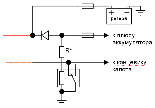 4). (?) В случае просадки напряжения, срабатывает вход сигнализации для концевика капота. Плюс такого решения: АЗ/ДЗ отключается. Минус: сигналка орет как резанная. Принимаются предложения по улучшению.