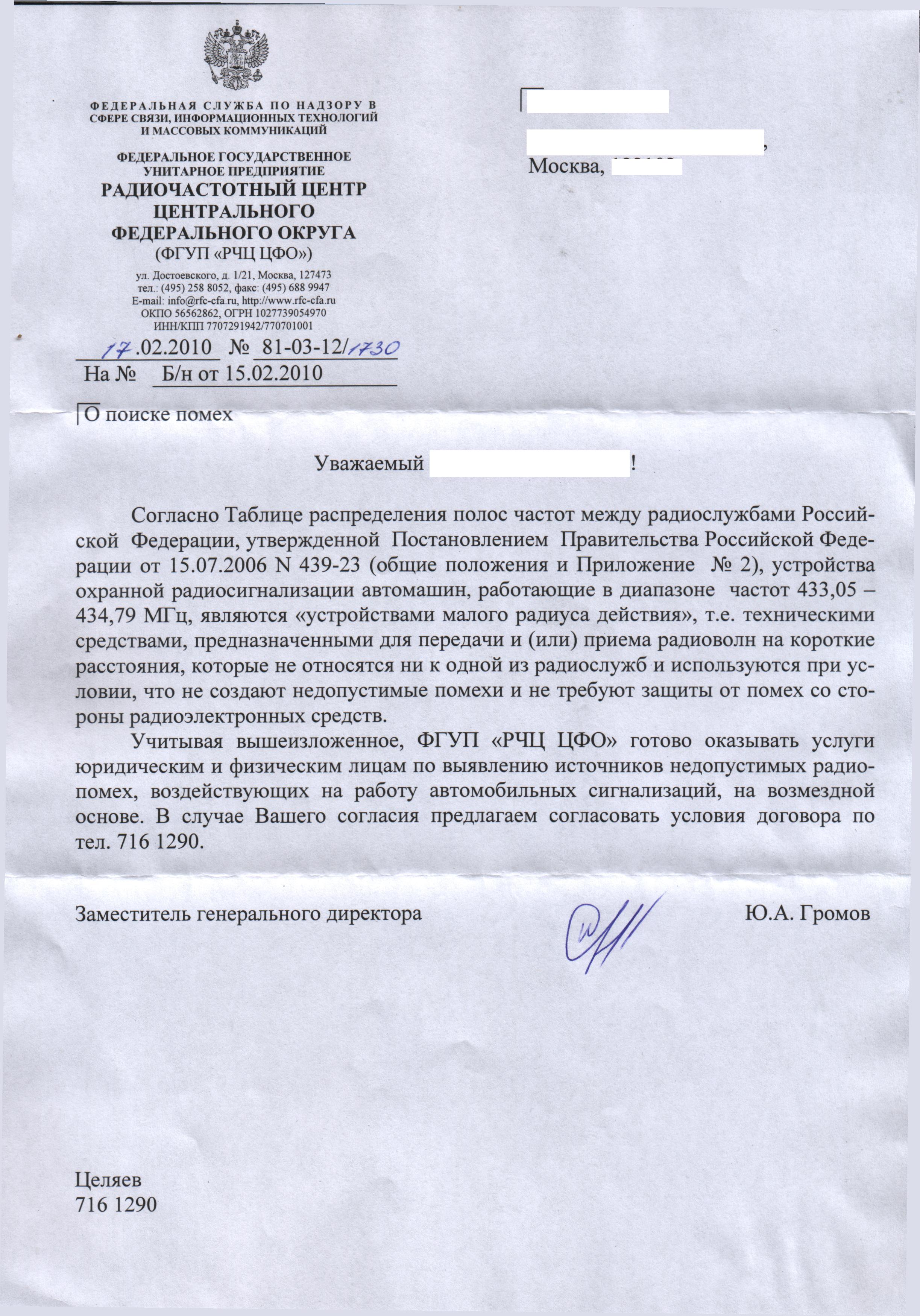 Я самостоятельно обратился со своей жалобой в ФГУП «Радиочастотный центр Центрального федерального округа». По моему обращению зарегистрирована заявка №1682 от 15.02.10.