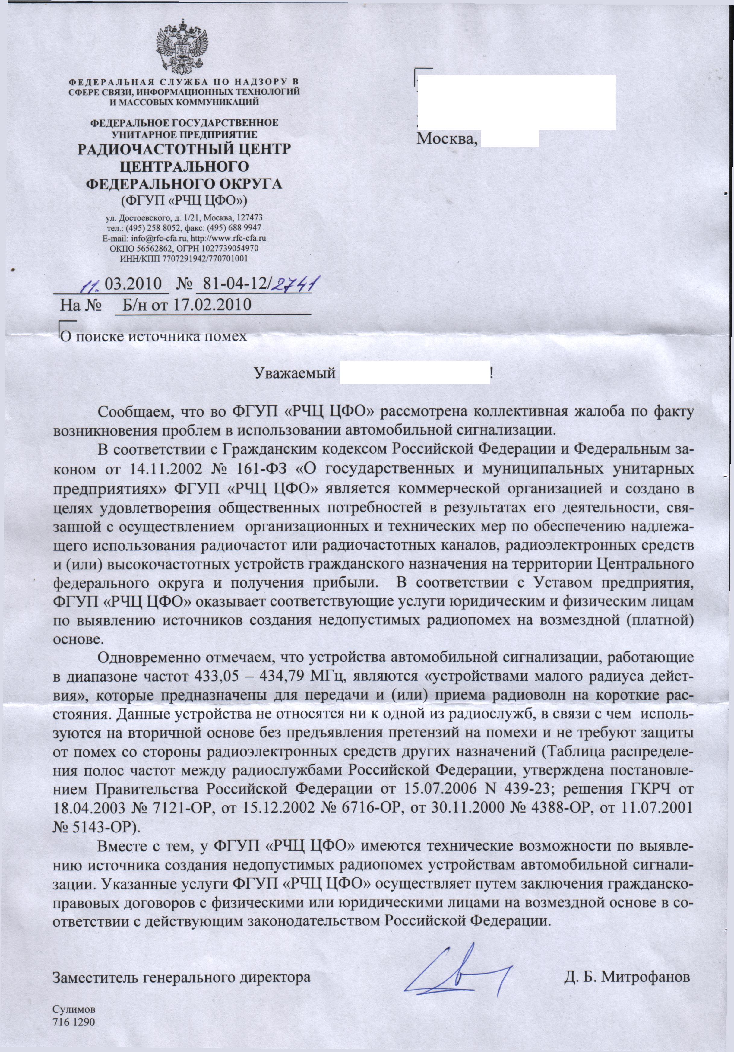 В связи с невозможностью полноценного использования автомобильных радиосигнализаций исключительно в районе нашего проживания и отсутствия альтернативы обращения в соответствующие инстанции для устранения радиопомех кроме ФГУП «РЧЦ ЦФО», на лицо нарушение наших гражданских прав и свобод, гарантированных Конституцией РФ, и мы обращаемся к Вам, вышестоящей организации в иерархии подведомственных предприятий, с целью принуждения ФГУП «РЧЦ ЦФО» проведения измерительных работ по поиску и устранению радиопомехи на безвозмездной основе, либо с целью предложения Вами альтернативного пути решения проблемы без оплаты с нашей стороны.