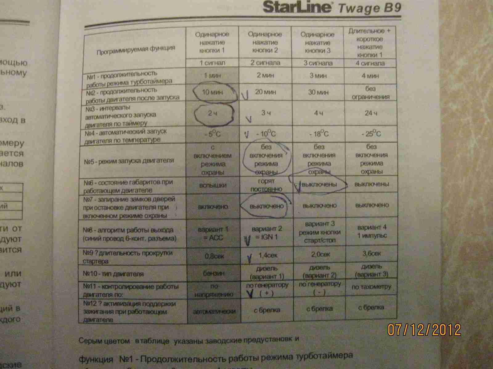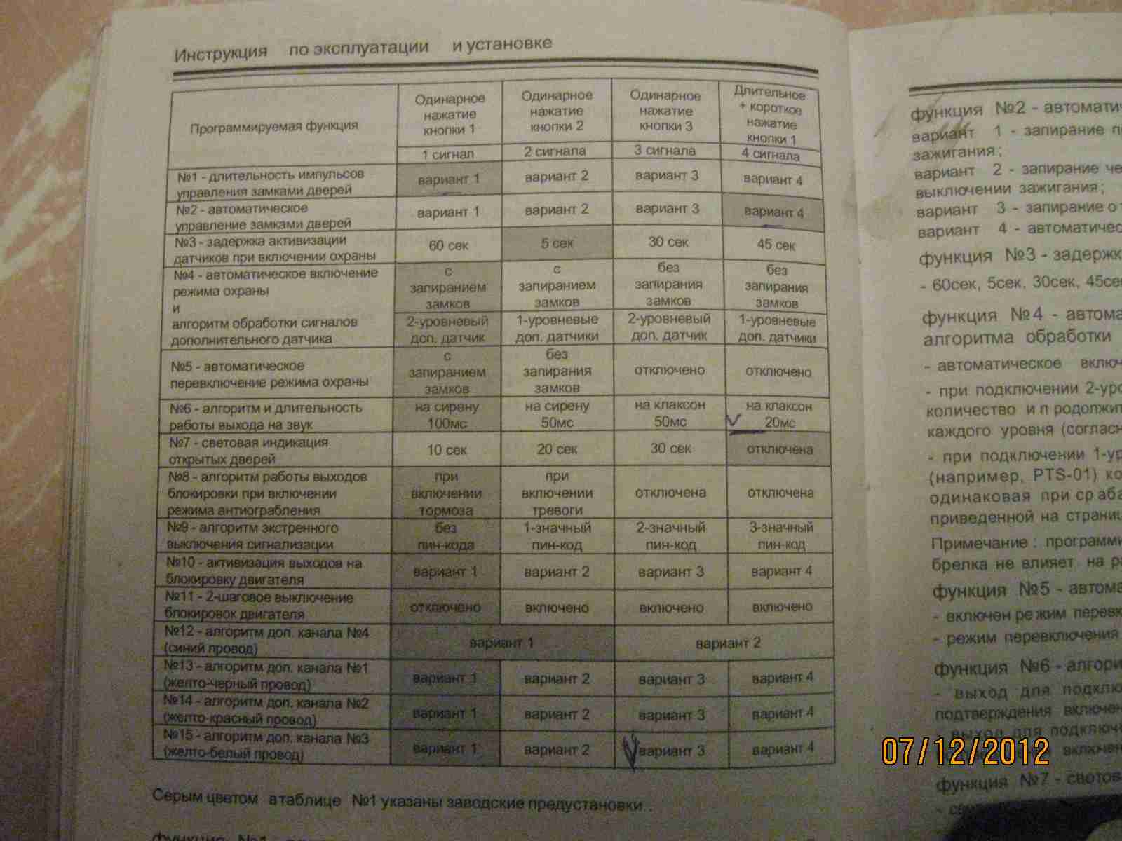 Затем во второй таблице ФУНКЦИЮ 7 (запирание замков дверей при остановке двигателя при включенной охране) установть в ЛЮБОЕ ЗНАЧЕНИЕ ИЗ СЛЕДУЮЩИХ - (2,3,4 - выключено), кроме ПЕРВОГО (ВКЛЮЧЕНО).