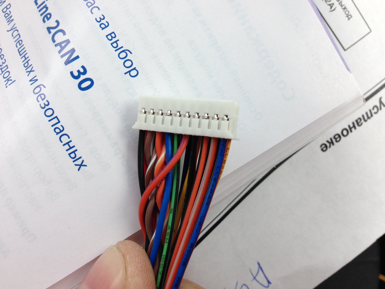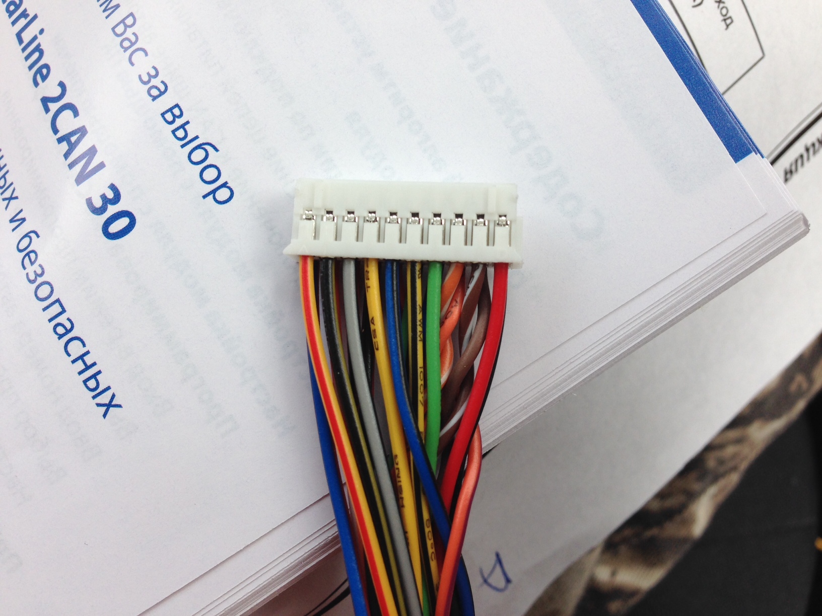 И во-вторых почему то сигналы дверей с CAN модуля перепутались у меня с педалью тормоза! По инструкции педаль тормоза - оранжево/фиолетовый, а двери - сине/чёрный, в программаторе настройки были такие-же. В режиме охраны нажимал на тормоз - получал срабатывание концевиков дверей на брелке! В итоге в CAN программаторе поменял местами эти провода (сделал педаль тормоза - сине/чёрный, а двери - оранжево/фиолетовый) и всё встало на свои места - при открытии дверей охрана срабатывает правильно, при нажатии на тормоз сига снимается с поддержки зажигания как и должна! К сожалению весь процесс не зафоткал, есть только фотки штекера от 2CAN30.