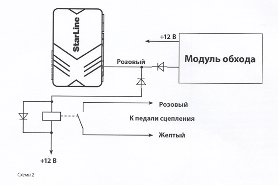 и именно по цепи РОЗОВОГО провода, если он использован для управления двумя цепями надо ставить ДВА ДИОДА - катодами (полосками), соединив их вместе, подключить к розовому проводу, анодами - РАЗДЕЛЬНО к проводу управления обходчиком и проводом управления реле имитации нажатия сцепления. Такое может потребоваться, если обходчик и реле запитаны С РАЗНЫХ питаний (например обходчик с неотключаемого +12, а реле имитации педали с зажигания...). Я предпочитаю запитывать их ВПАРАЛЛЕЛЬ с одного питания (когда сам монтирую подобные цепи на подобные автомобили). Тогда диоды не нужны...