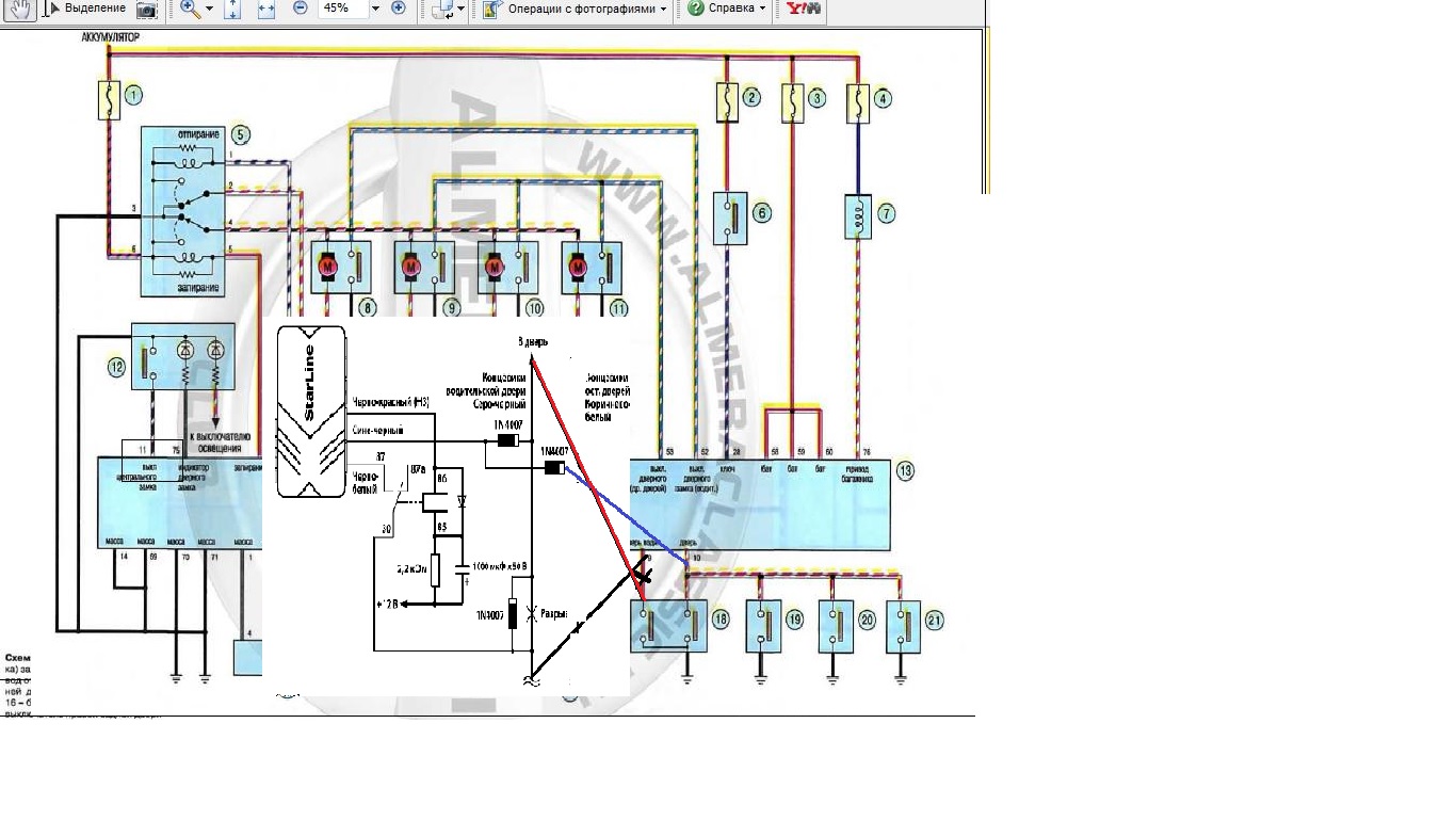 2) сине-черный провод идет не как указано на схеме отдельно на водительский и "остальные" а только на "концевик всех дверей" как в схеме по установке на альмеру.