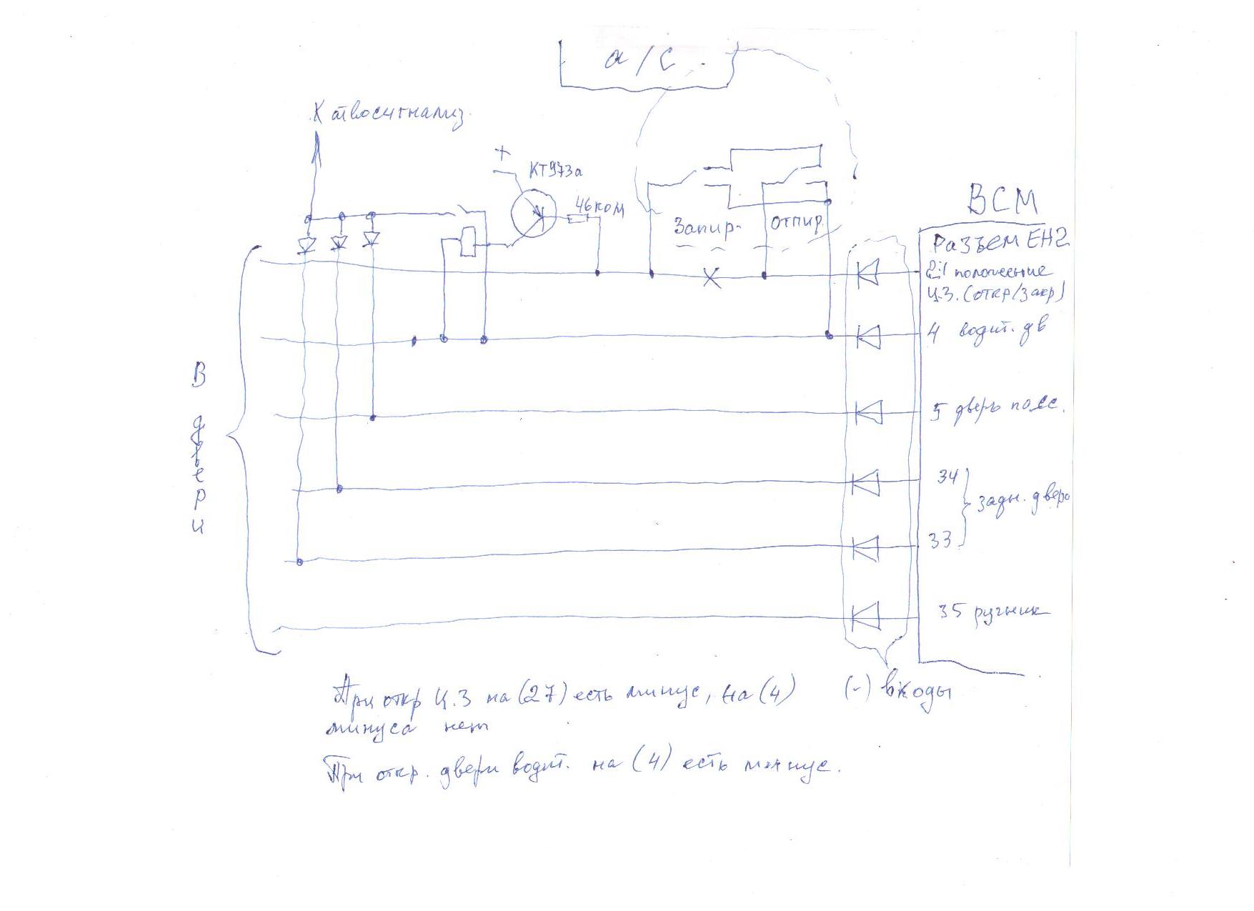 Провод статуса Ц.З при откр.(-) при закр.(-)нет на том-же разъеме где концевики дверей. Подключаю базу транзистора PNP зерез сопротивление к этому проводу, получаем на выходе с коллектора + при откр.Ц.З . его на обмотку реле ,другой провод обмотки на концевик водит. двери, получаем только при откр. водит. двери срабатывание реле. Провода от ВСМ отвязать диодами.Варианты- вместо реле можно поставить транзистор .
