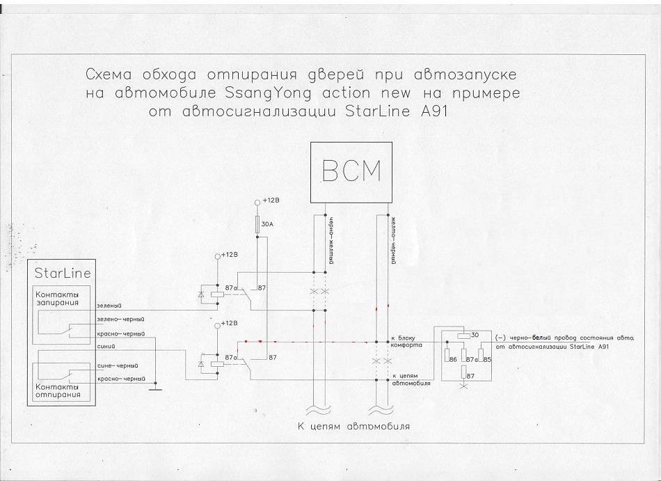1. Лишняя цепь от контакта 87а реле отпирания до желто-черного провода (дублируется через контакты 30-87а допреле).