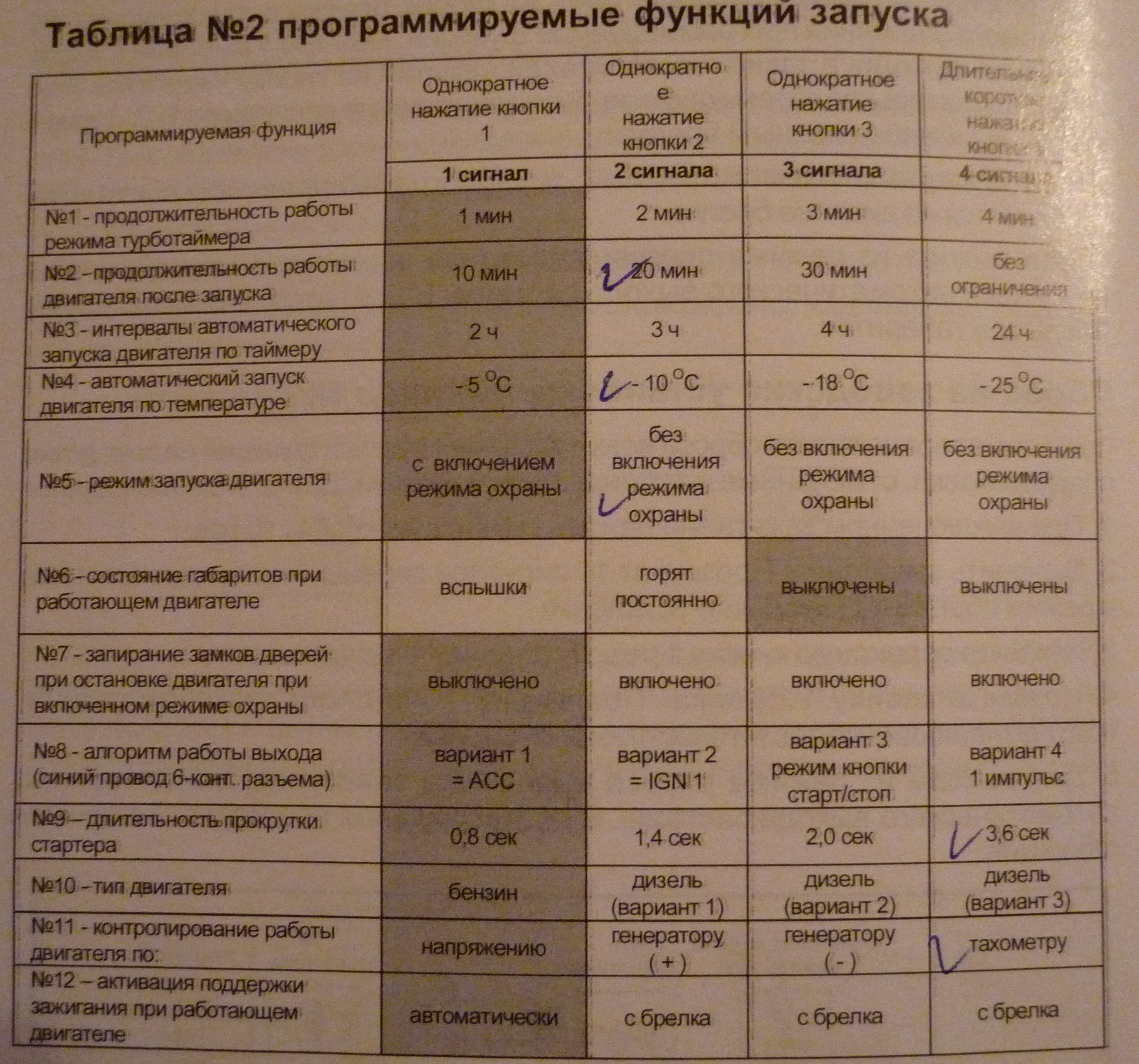 Доброго времени суток. Помогите разобраться со следующим. При установке сигнализации в инструкции по установке, в таблице №2(программируемые функции запуска) стр.36 , установщик отметил галочками параметры: см.фото. Вопрос вот в чём: функция "№5-режим запуска двигателя" отмечен галочкой -> без включения режима охраны. Тоесть это получается при Т= -10 градусов двигатель сам заведется на 20 минут, НО в этот период времени машина будет не под охраной ? Тоесть подходи любой открывай её и садись ??
